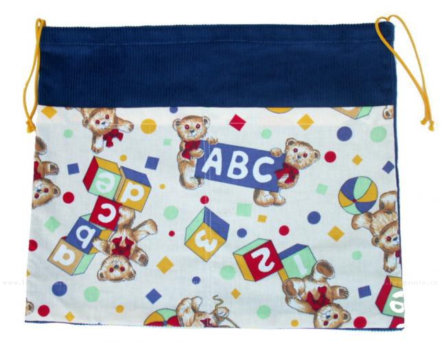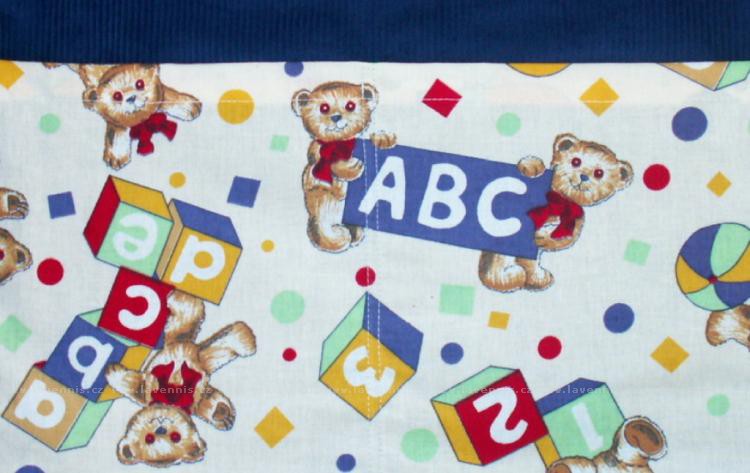Kombinace pevného manšestru a vzoru s písmenky a čísly v rukou medvídků.